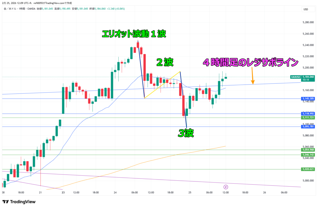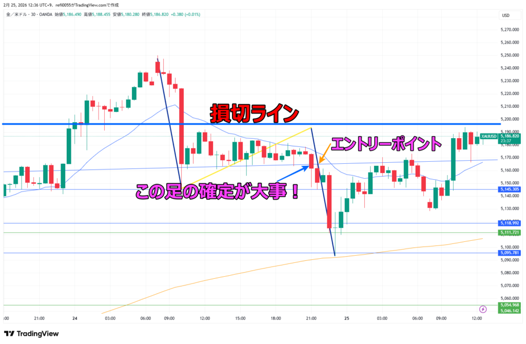 上の画像は1時間足を表示させており、エントリーポイントはそれよりも下位足で見ていきます。
